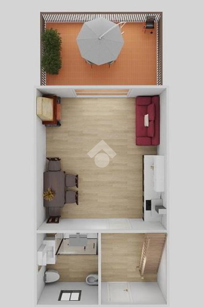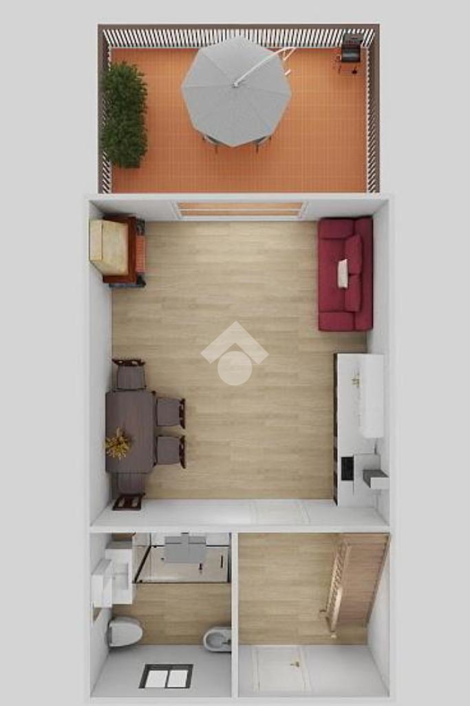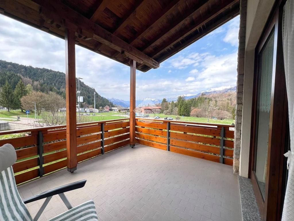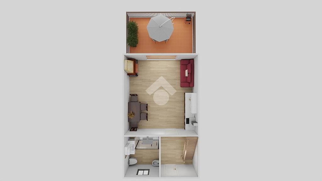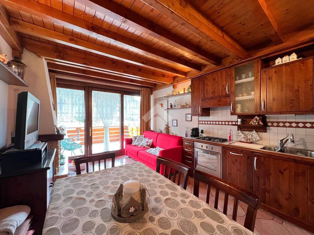 L’ingresso conduce alla luminosa zona giorno con angolo cottura, divano letto, camino e accesso diretto all'ampio terrazzo abitabile, ideale per godere degli spazi esterni.
